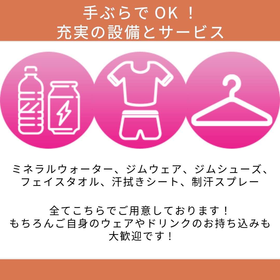 ドリンク・ウェア・室内シューズ等トレーニングに使うものは無料でご準備しておりますが、ご愛用のものをお持ちいただくことも歓迎しております。